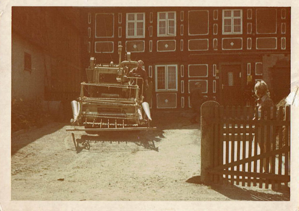 Meiner Meinung müsste das ein Lanz Mähdrescher sein. Charakteristisch ist die gelbe Farbe, die Anordnung des Luftfilters und das Lenkgestänge. Ähnlichkeiten zu https://www.op-online.de/region/babenhausen/gedroschen-einst-1334510.html sind eindeutig.